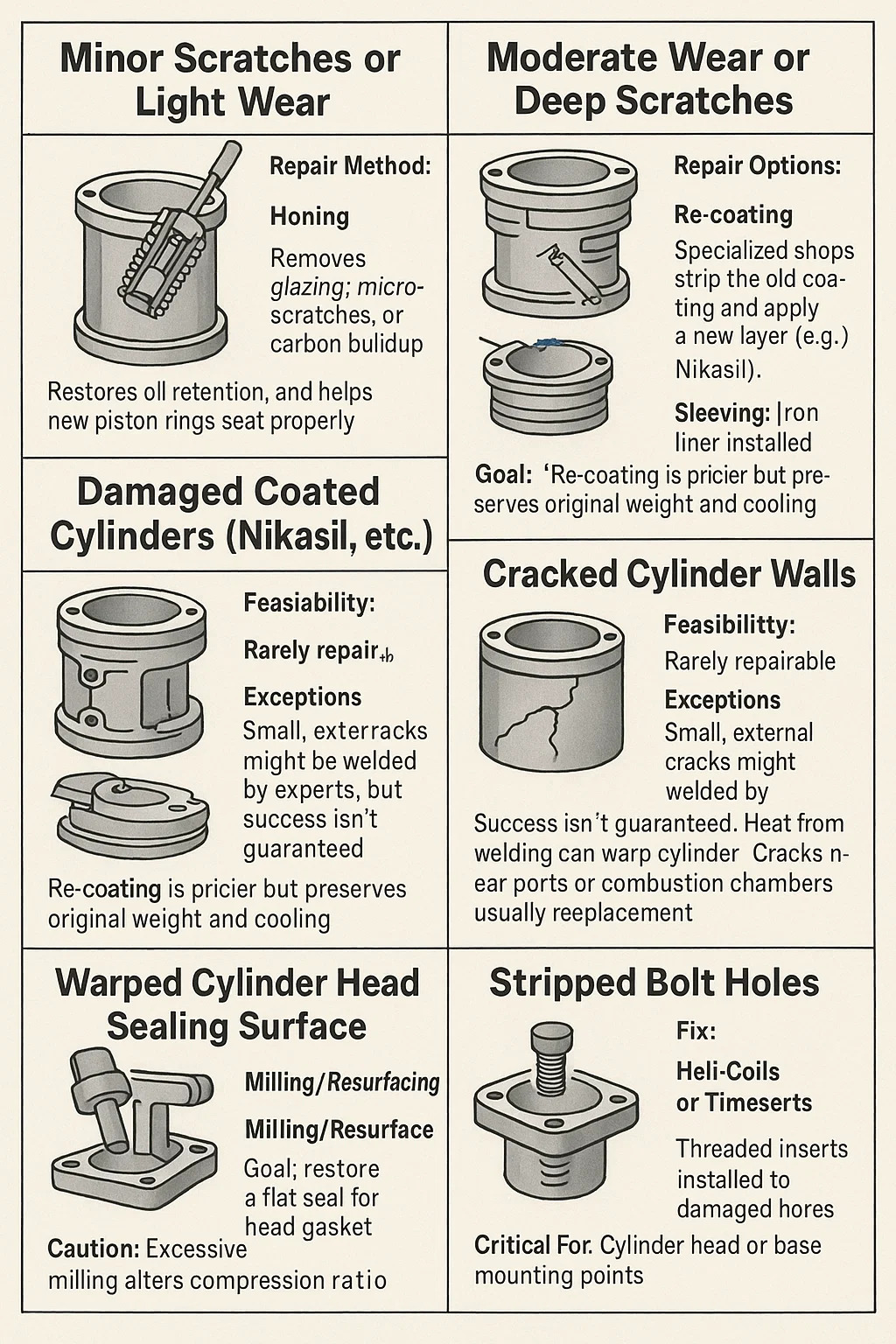 একেবারে, মোটর সাইকেল সিলিন্ডার ক্ষতির ধরন এবং তীব্রতার উপর নির্ভর করে প্রায়ই মেরামত করা যেতে পারে। এখানে একটি ব্যবহারিক ব্রেকডাউন আছে: