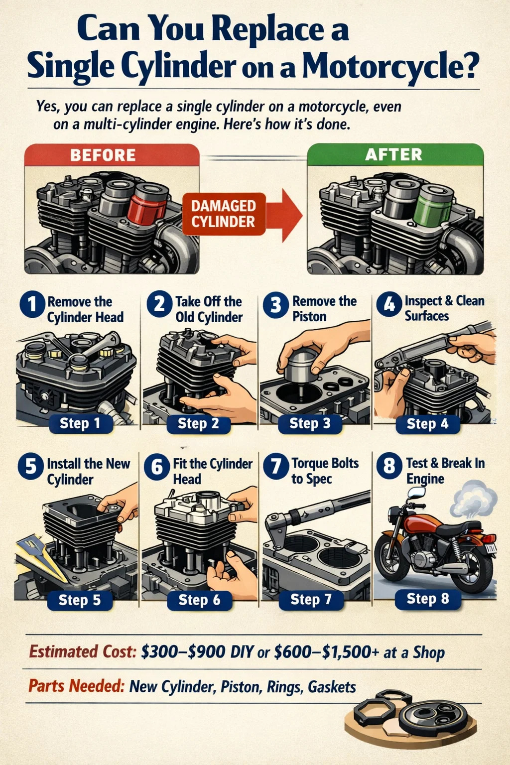 সংক্ষিপ্ত উত্তর হল হ্যাঁ — আপনি একটি একক মোটরসাইকেল সিলিন্ডার প্রতিস্থাপন করতে পারেন, এবং বিশেষ করে একক-সিলিন্ডার বাইকের জন্য, এটি একজন অভিজ্ঞ হোম মেকানিক বা দোকানের ইঞ্জিনের কাজগুলির মধ্যে একটি। আপনি একটি স্কোর করা বোর, একটি ফাটল ব্যারেল বা গুরুতর পরিধানের সাথে কাজ করছেন যা হোনিং আর ঠিক করতে পারে না, সিলিন্ডারটি অদলবদল করা একটি সুপ্রতিষ্ঠিত মেরামতের পথ। মাল্টি-সিলিন্ডার মোটরসাইকেলগুলিতে, একই নীতি প্রযোজ্য: সম্পূর্ণ ইঞ্জিন টান বা পুনর্নির্মাণ না করেই পৃথক সিলিন্ডারগুলি প্রতিস্থাপন করা যেতে পারে, যদিও জড়িত সিলিন্ডারের সংখ্যার সাথে জটিলতা বৃদ্ধি পায়।