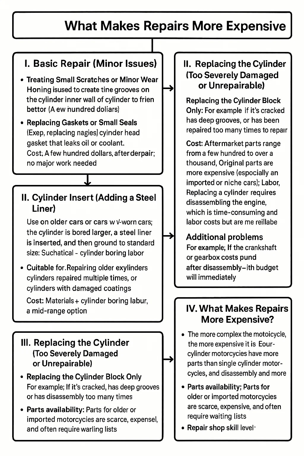 মেরামতের দোকানের দক্ষতার স্তর: রাস্তার পাশের দোকানগুলি সস্তা কিন্তু তাদের দক্ষতা অবিশ্বস্ত; বিশেষায়িত মোটরসাইকেল মেরামতের দোকান বা প্রতিষ্ঠিত দোকানগুলি বেশি চার্জ করে তবে আরও নির্ভরযোগ্য।