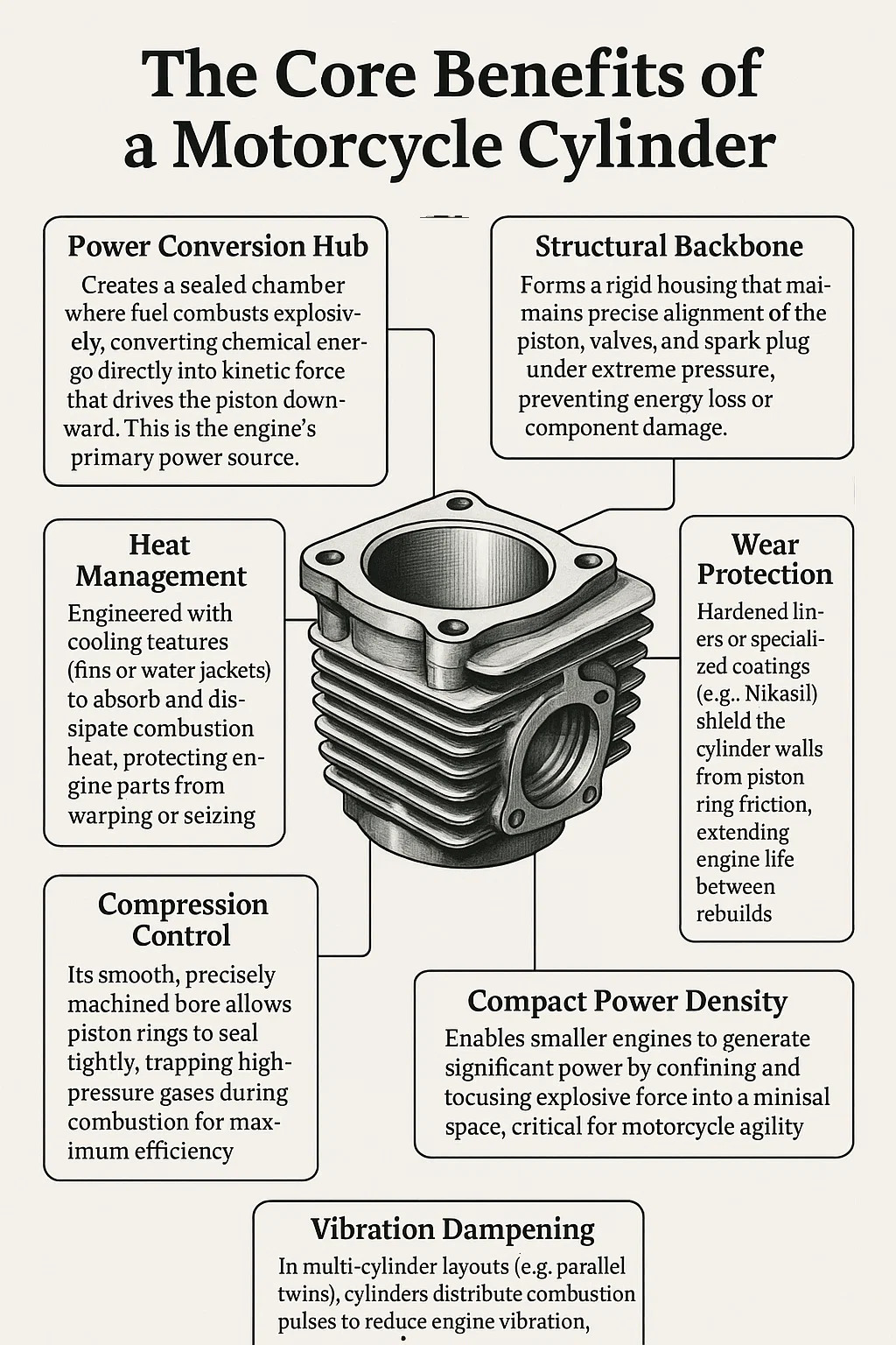 এখানে একটি মূল সুবিধা আছে মোটর সাইকেল সিলিন্ডার , ব্যবহারিকভাবে ব্যাখ্যা করা হয়েছে: