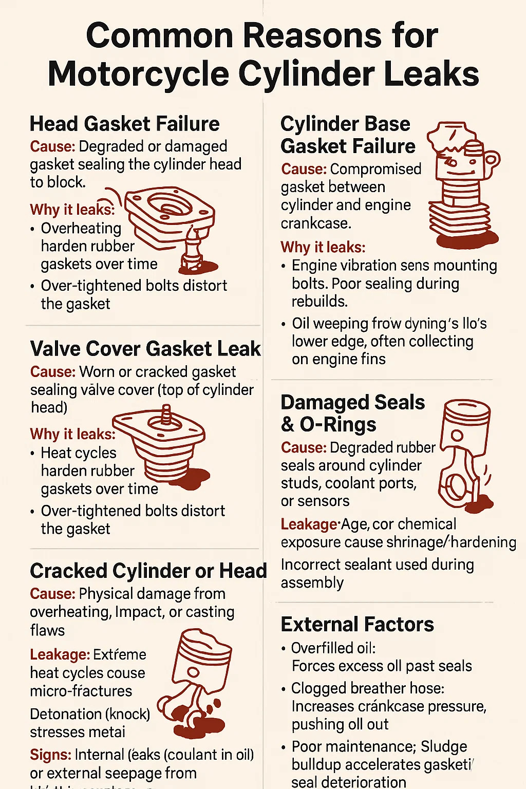 এখানে জন্য সাধারণ কারণ আছে মোটর সাইকেল সিলিন্ডার ফাঁস: